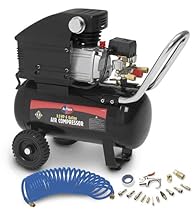 APC4016A 3.5 Peak HP 6 Gallon Air Compressor with Accessories includes -3.5 Peak HP 6 Gallon Air Compressor. -1 Blow Gun. -1 High Pressure Nozzle. -1 Tapered Rubble Nozzle. -1 Air Chuck. -1 Needle Chuck. -1 Tapered Chuck. -1 Safety Nozzle. -1 Quick-Connect Coupler. -1 Tape Sealer. -2 Male Quick-Connectors. -4 Female Quick- Connectors. Features: -120V/60HZ. -6 Gallon Tank. -5.2 CFM at 40 PSI. -4.2 CFM at 90 PSI. -Maximum Pressure: 115 PSI. -2.5 HP Continuous 3.5 HP Peak. -Oil lubrication for long Life. -Thermal overload protection for safety. -Heavy-duty rubber tires. -2 Quick-connect outlets. -25' coil hose. Owners Manual
