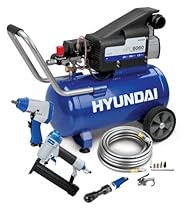 Hyundai Air Compressor Kit 6 gal. 1.5HP 125 PSI 3400 RPM 7 pc. accessory kit: blow gun rubber blow gun tip coupler attachment safety nozzle extension tapered inflator inflation needle.